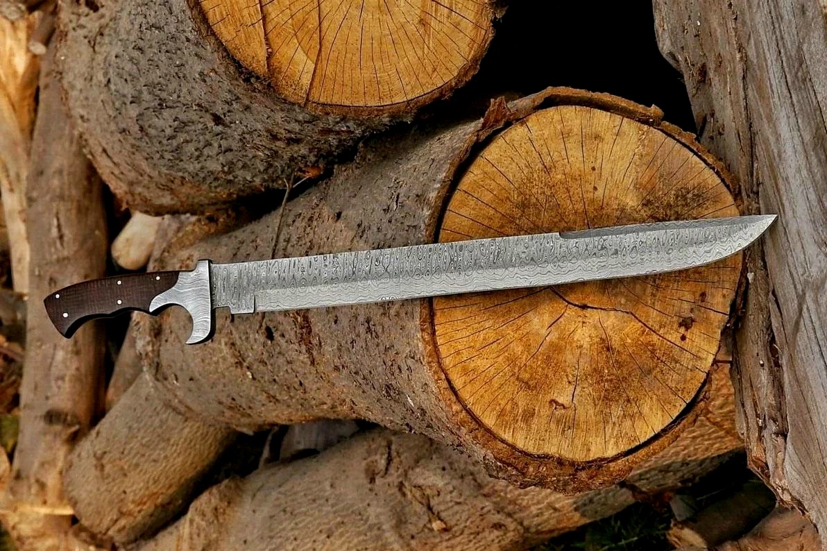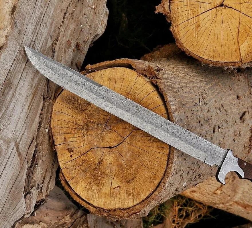 The blade of this big machete knife is hand-forged from high-quality Damascus steel, known for its distinctive wavy patterns and exceptional durability. Measuring a full 26 inches, the blade offers an extended cutting reach—perfect for