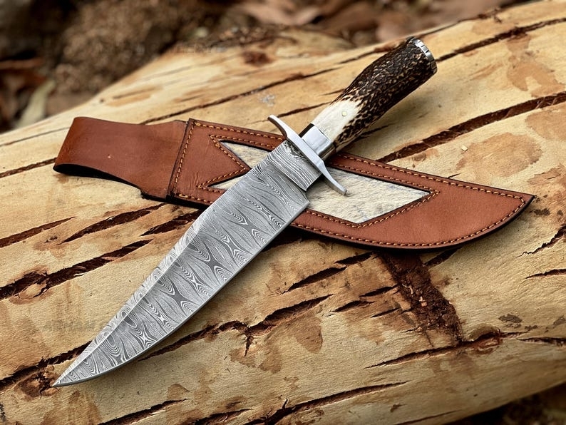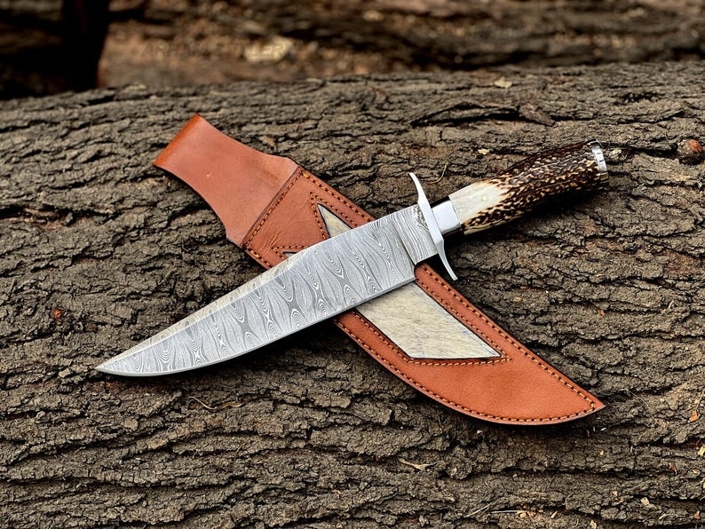Be the first to review “Damascus steel hunting knife with antler handle and ram hair leather sheath”